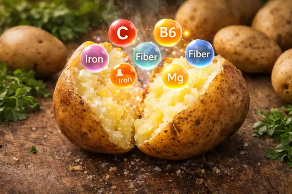 يعتقد الكثيرون أن البطاطس مجرد “نشويات”، لكن الحقيقة أنها كنز غذائي إذا طُبخت بطريقة صحيحة. حبة بطاطس متوسطة الحجم (مسلوقة أو مشوية بالقشر) تحتوي على: